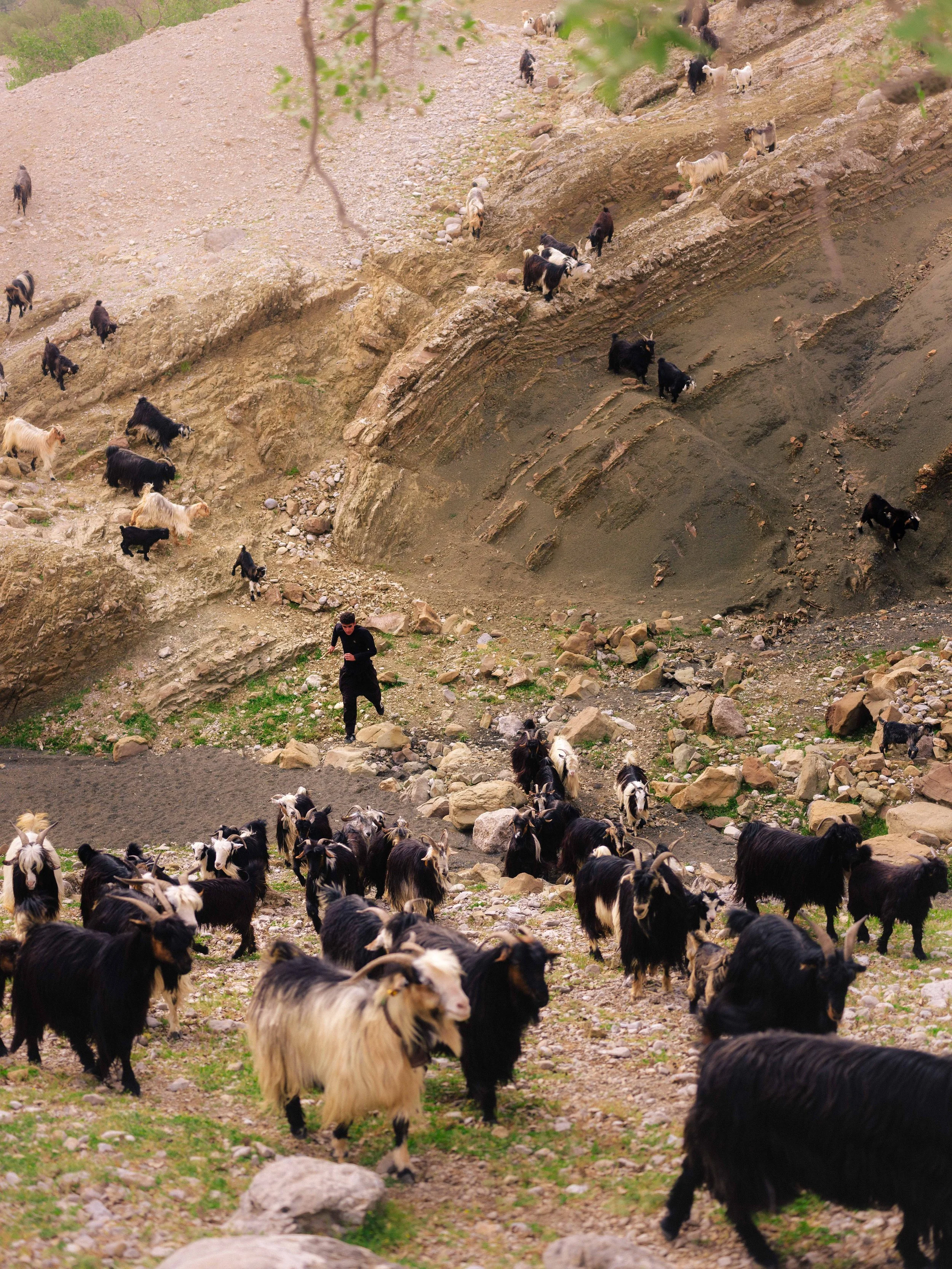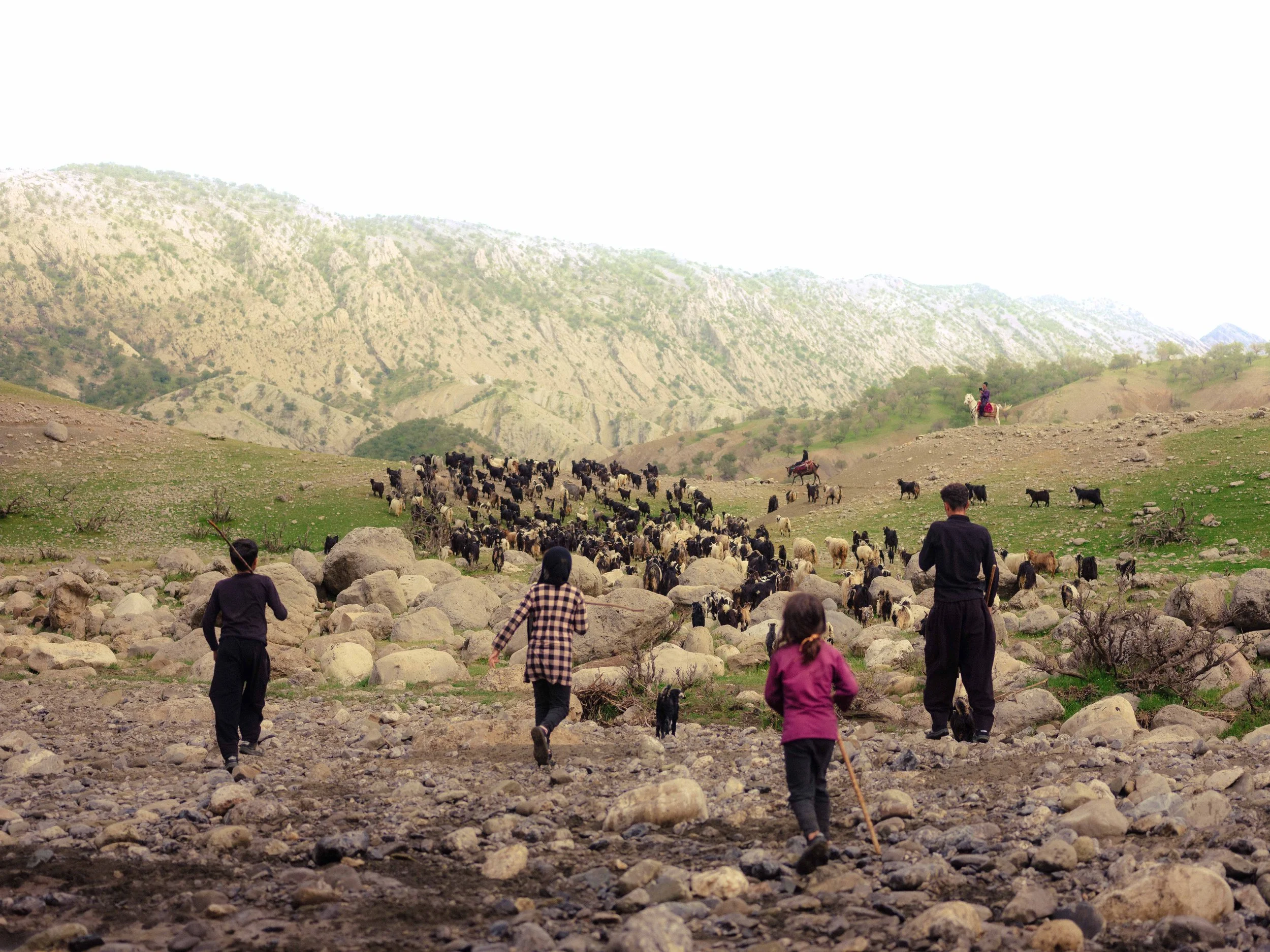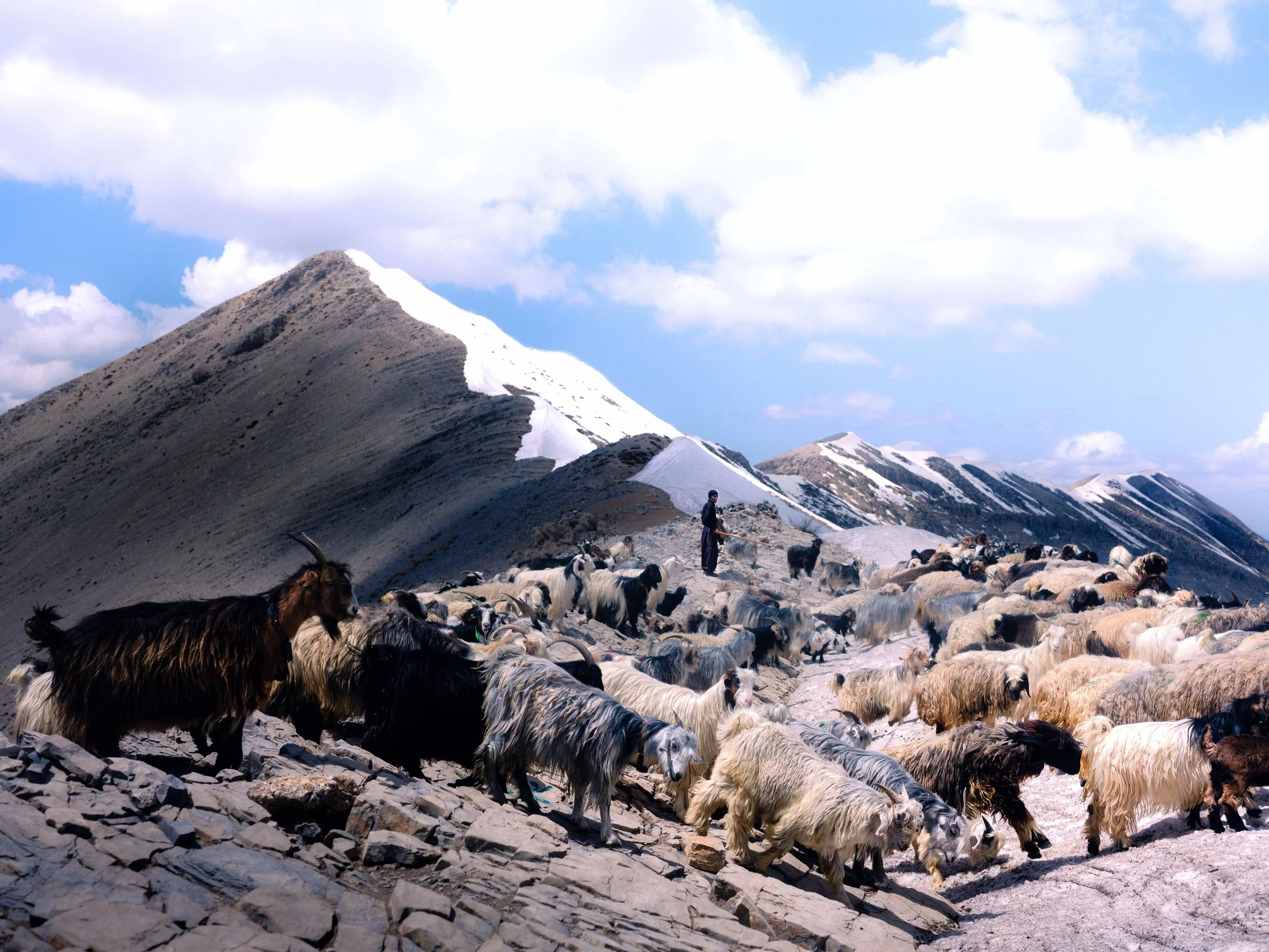 The goat herd is the responsibility of the sons - guiding, counting, and protecting. Being a demanding task on foot, they set off before the rest of the family, who travel with horses, donkeys, and the rest of the camp items. Most follow this tradition of splitting the entire family into two groups - the men and the sons with the goat herd, and the “Family group” consisting of women, children, horses, pack animals, and supplies.